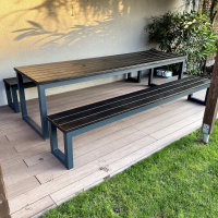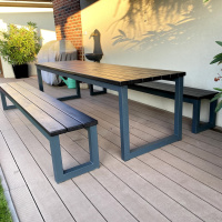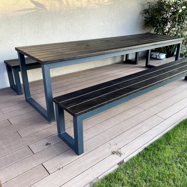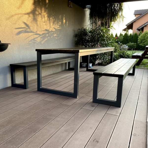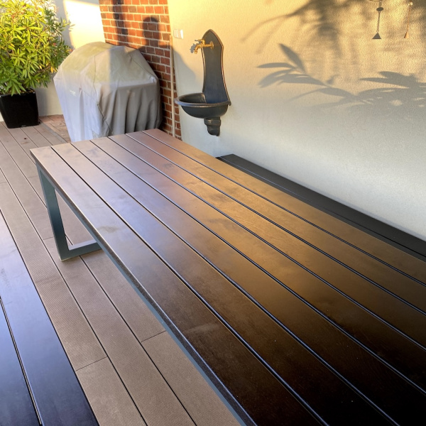Das Eichenholz wurde mit der OSMO Öl-Beize (Schwarz) und dem OSMO Terrassen-Öl 420 (Farblos) behandelt. Das Untergestell ist aus Stahl gefertigt und mit einer zweischichtigen Pulverbeschichtung (Komaxit) versehen.