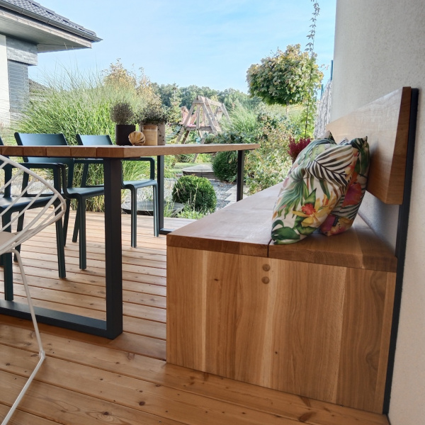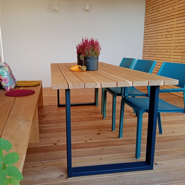 Frau Jirglová von Bellusdesign.cz (Interieur- und Gartendesignerin) wandte sich an uns mit dem Wunsch nach einer Sonderanfertigung eines Gartentisches in der Kombination aus Holz und Stahl, ergänzt durch eine passende Bank.