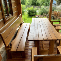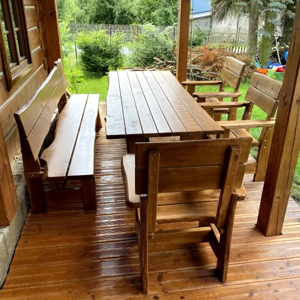 Dieses Gartenmöbel-Set aus Eiche im rustikalen Design haben wir auf die Terrasse des Ferienhauses geliefert.