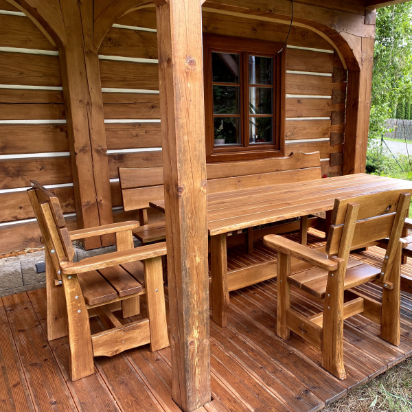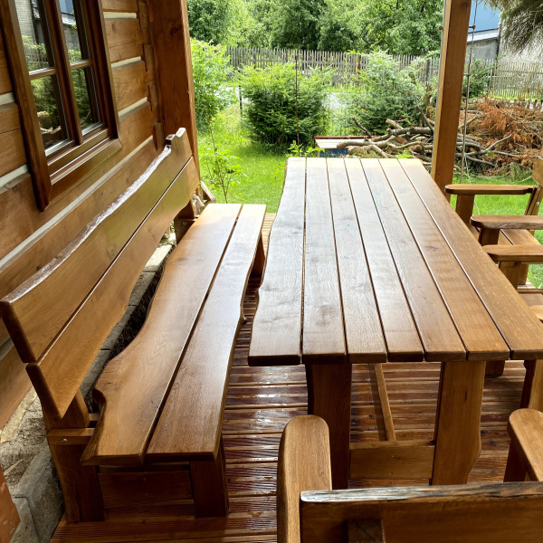 Das Set besteht aus einem Eichentisch mit den Maßen 200 x 90 cm, einer Eichenbank mit einer Länge von 200 cm und 3 Sesseln. Das Standard-Set enthält normalerweise 2 Sessel, auf Kundenwunsch haben wir jedoch 3 Sessel geliefert. Das ist bei uns kein Problem – wir fertigen alles individuell nach Ihren Wünschen an.