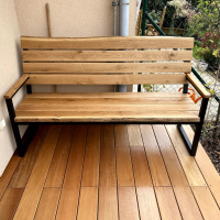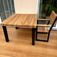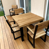 Die Garnitur besteht aus einem Tisch, einer Bank und 4 Stühlen. Die Tischplatte wurde aus massiven Eichenbohlen gefertigt. Die Oberfläche der Eichenkomponenten ist mit einem Ölanstrich behandelt.