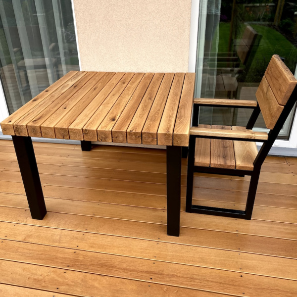 Die Garnitur besteht aus einem Tisch, einer Bank und 4 Stühlen. Die Tischplatte wurde aus massiven Eichenbohlen gefertigt. Die Oberfläche der Eichenkomponenten ist mit einem Ölanstrich behandelt.