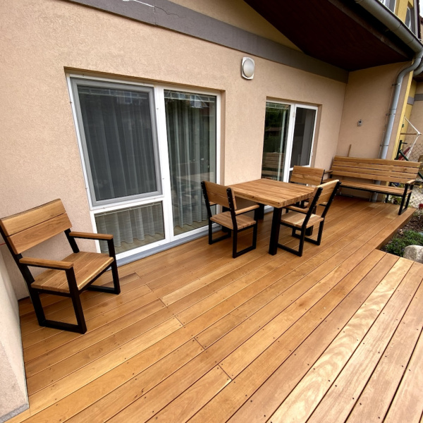 Dieses Garten-Set aus Eiche hat seinen Platz auf der Terrasse gefunden.
